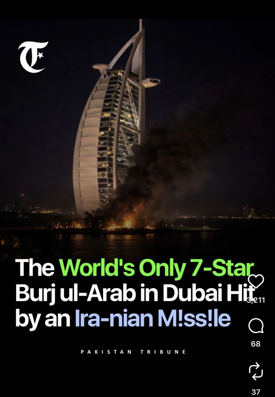 全球唯一七星级酒店——帆船酒店(阿拉伯塔酒店Burj Al Arab)在袭击中受损。世界第一高楼哈利法塔一度紧急疏散。