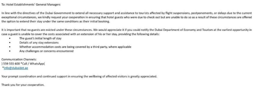 根据迪拜政府的指示,为向因当前特殊情况导致航班取消、延期或延误而受影响的游客提供一切必要的支持与协助,我们恳请贵方配合,确保原定退房但因相关情况无法按时离店的住客,可在与原预订相同条件下选择延长住宿。