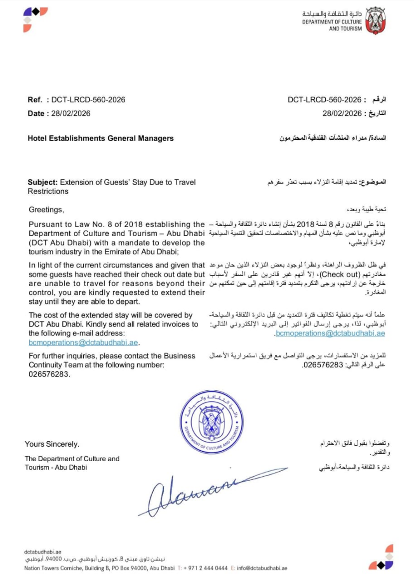 根据2018年第8号法律,该部门负责推动酋长国旅游业发展。鉴于当前形势,部分住客已到原定退房日期,但因不可抗力无法离境,相关酒店须为其延长住宿时间,直至能够顺利出行。延住期间产生的费用,将由阿布扎比文化与旅游部承担。相关发票统一报送指定邮箱结算。