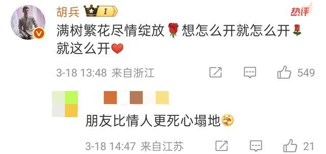 胡兵也是现身好朋友的评论区,留下了友谊的足迹。胡兵写道:“满树繁华尽情绽放,想怎么开就怎么开。”