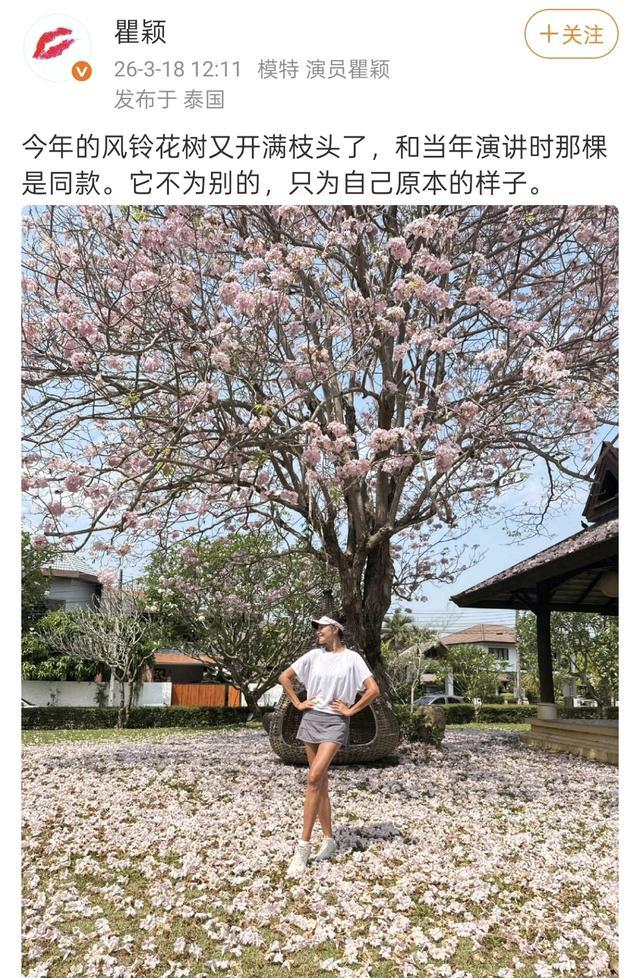 3月18日,瞿颖在社交平台上晒出了自己的春日美照,并配文写道:“今年的风铃花树又开满枝头了,和当年演讲时那棵是同款。它不为别的,只为自己原本的样子。”